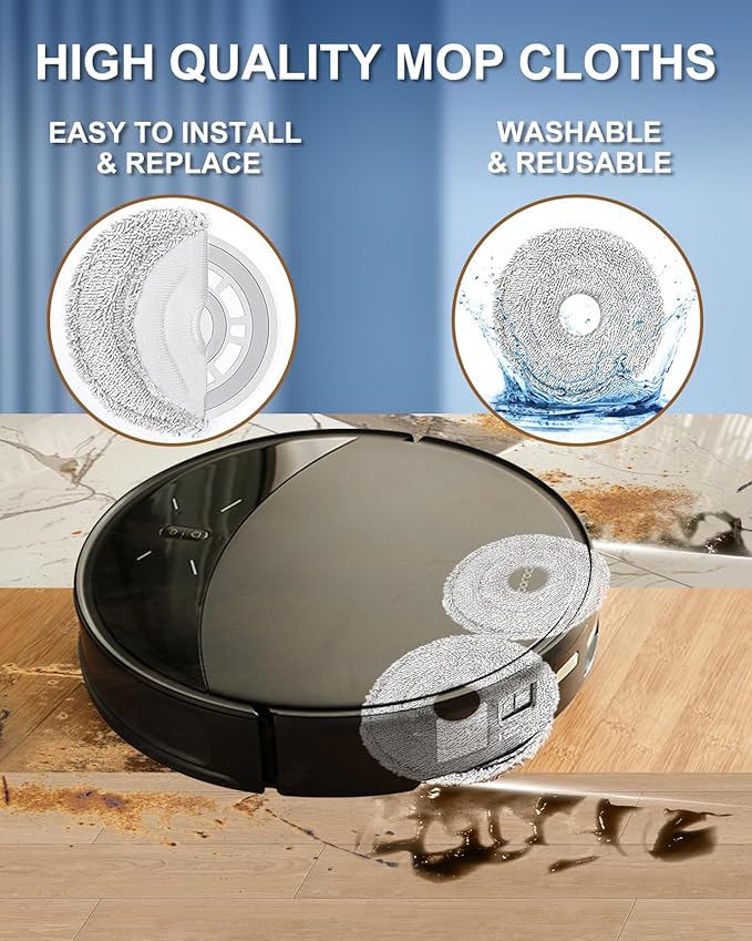 - 【HIGH QUALITY MOP CLOTHS】 Crafted from ultra-fine microfiber, the mop cloths effortlessly remove various types of dirt, including fine dust, kitchen grease, and pet hair. Suitable for sealed floors such as tiles, hardwood, and stone. The microfiber mop pad is absorbent and dries quickly, can be washed in the washing machine, and be reused many times. You can easily to install them, and replace the old attachment directly and the robot mop cloth can be firmly attached and will not fall off easily