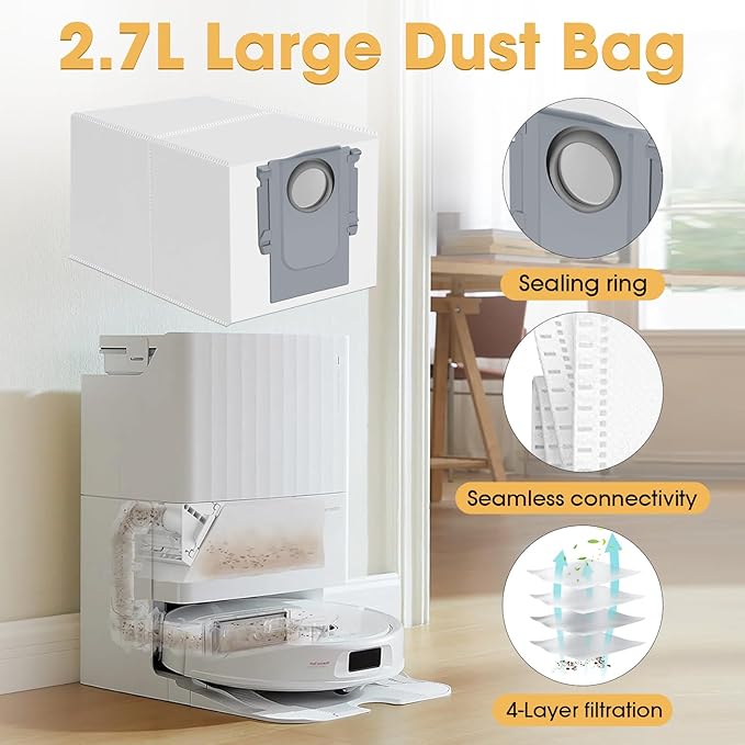 - 【High-Capacity Dust Bags】: Specially designed for Roborock Qrevo Edge robot vacuums, these premium-quality dust bags feature a 2.7L large storage capacity, allowing you to go longer between replacements and reduce the hassle of frequent emptying. Each bag is built with a multi-layer filtration system and an airtight sealing design to securely lock in dust, debris, and pet hair without leaks. This not only keeps your vacuum performing at its best but also helps maintain a cleaner, healthier home environment for your family.