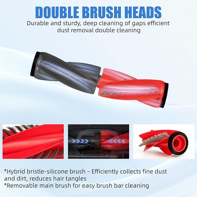 - Main Brush/Roller Brush:Designed for Saros10R,this hybrid bristle-silicone brush ensures deep cleaning on carpets and hard floors. Easy to remove and clean