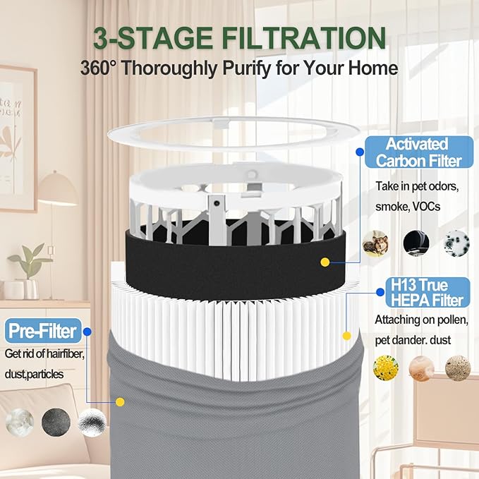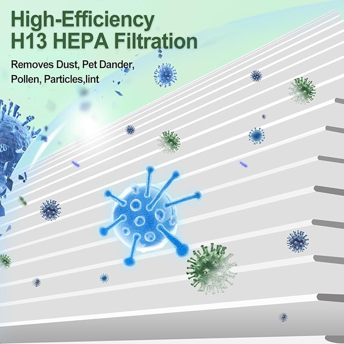 - ✅ 99.97% High-Efficiency Filtration: Captures microscopic particles as small as 0.3 microns—ideal for pet hair, pollen, and everyday dust—keeping your home air fresh and clean without triggering respiratory sensitivity.