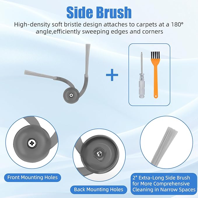 - Side Brush: Made of a durable TPE/Nylon composite,high-density soft bristle design attaches to carpets at a 180° angle,efficiently sweeping edges and corners
