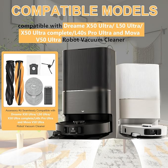 - [Product Compatibility]:Accessory Kit Compatible with Dreame X50 Ultra/ L50 Ultra/ L40s Pro Ultra and Mova V50 Ultra Robotic Vacuum Cleaners, please confirm your robot model before purchase.