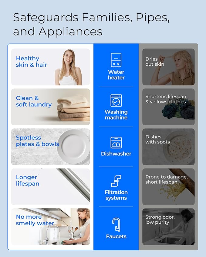 - [Protects Water Appliances] Protects your family, plumbing, and appliances by reducing water-related damage throughout the home. From healthier skin and softer laundry to spotless dishes and longer-lasting filtration systems, enjoy cleaner water and improved performance every day.