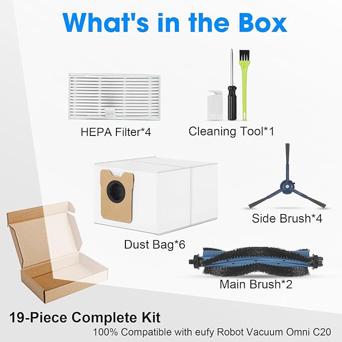 19-Pack Replacement Accessories Kit for eufy Omni C20 Vacuum Cleaner Includes Main Brush, HEPA Filters, Dust Bags, Side Brushes High-Performance Compatible with eufy Robot Vacuum
