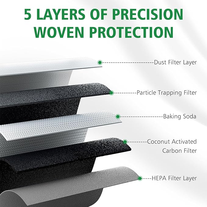 - 【5TH Layers】: Dust Filter Layer, Particle Trapping Filter, Baking Soda, Coconut Activated Carbon Filter, HEPA Filter Layer. FILTER UP TO 99% OF AIR PARTICLES, Including hair, fine particles, dust and other particulate impurities