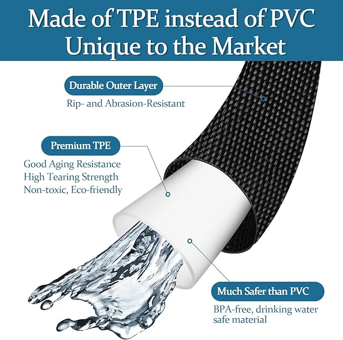 - [ All-Weather Flexibility ] Maintains flexibility down to -22 degrees Fahrenheit and can be used in temperatures up to 150 degrees Fahrenheit. Ordinary PVC hose has poor-resistance to low and high temperatures, and the hose loses performance under temperature changes, which can damage it. TPE's superior freeze-resistance provides durability to the hose.