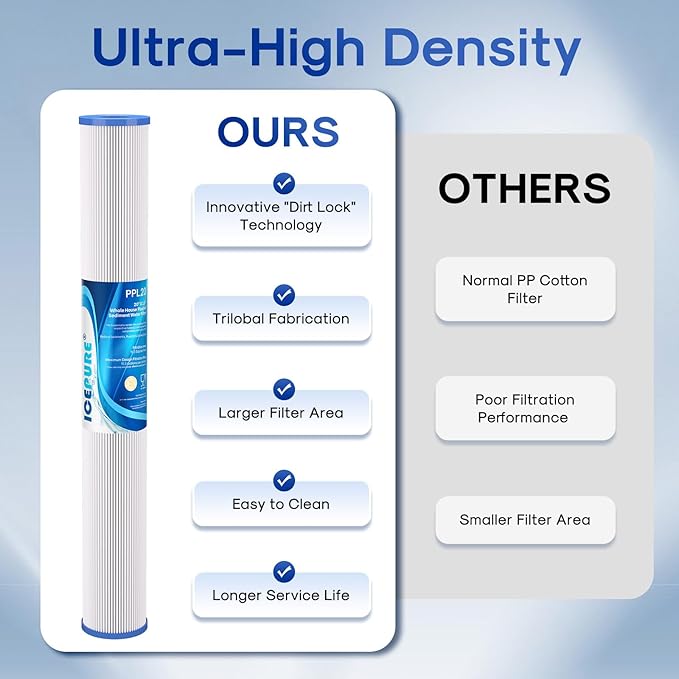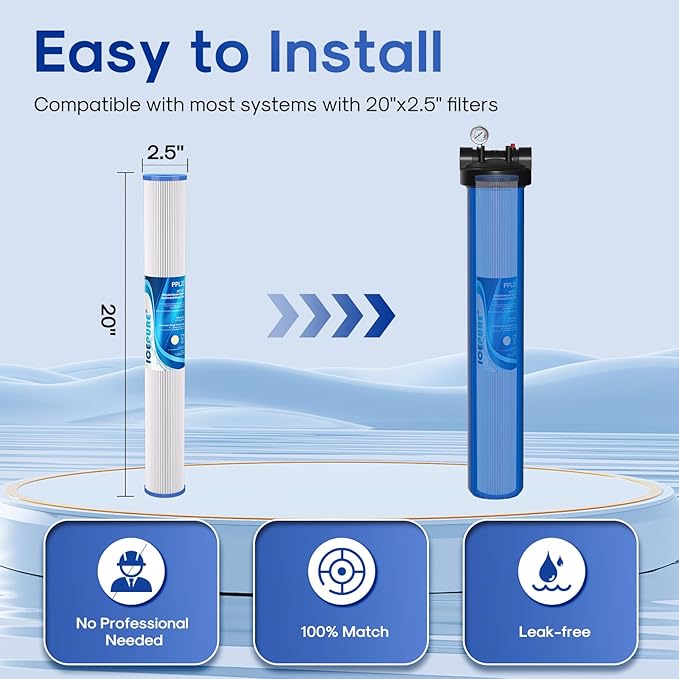 - High Quality - The ICEPURE PPL20-05 house water filter cartridges are made of food-grade materials, lead-free and BPA-free, meeting international drinking water safety standards. Our products have undergone multiple inspections and tests before leaving the factory. The pleated design not only enhances the dirt-holding capacity but also prevents the filter from deforming or cracking under high-pressure water flow.