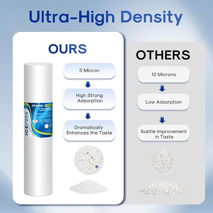 - Efficiently Purify Water Quality - The ICEPURE PP20BB whole house water filter adopts advanced technology and high-quality materials, significantly enhancing its filtration performance. It can effectively remove impurities such as rust, silt, sand, colloids, sediment, iron, particles, and odors from water. Moreover, with a filtration accuracy of 5 microns, it can filter out more impurities, protecting downstream water purification equipment and extending the service life of the filter.