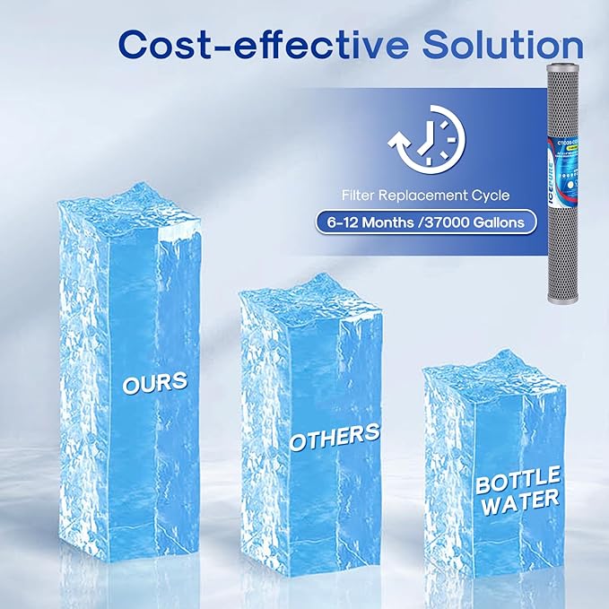 - High Cost Performance - The ICEPURE CTO20-CQB whole house water filter is compatible with a standard 20" x 2.5" size whole-house water filtration system. Compared with bottled water, the whole-house filtration solution not only provides you with clean purified water but also saves you on drinking water expenses, offering an extremely high cost performance.