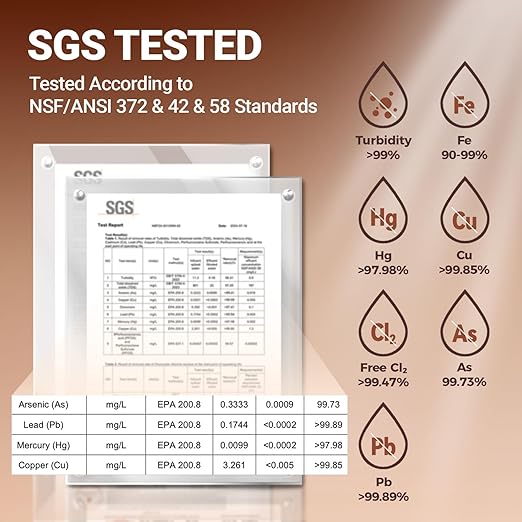 - NSF Certified 9-Stage: Experience laboratory-grade purification! Our advanced 9-stage system combines multiple filter media with a 0.01μm UF membrane to filter 98 %+ of substances, including PFAS/PFOS, heavy metals, chlorine and fluoride. Every component meets strict NSF/ANSI standards, with independent certification for your complete peace of mind