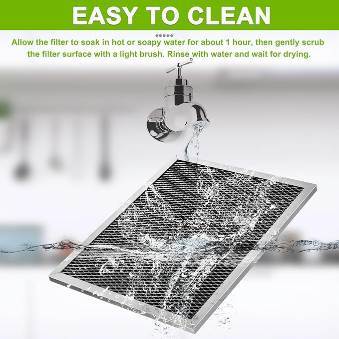 - Cleaning tip: Soak in hot water and degreaser for 10-20 minutes, gently stir to remove loose grease.To maintain the performance of the range hood, maintain air circulation and eliminate odors, it is recommended to replace the filter every 3-6 months