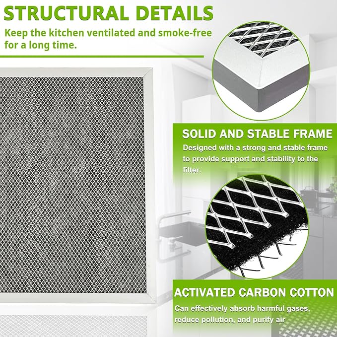 - Features A Grease Mesh And Charcoal Carbon Combination That Effectively Traps Grease, Smoke, Odors, And Other Particles, Keeping Your Kitchen Air Clean and Fresh.