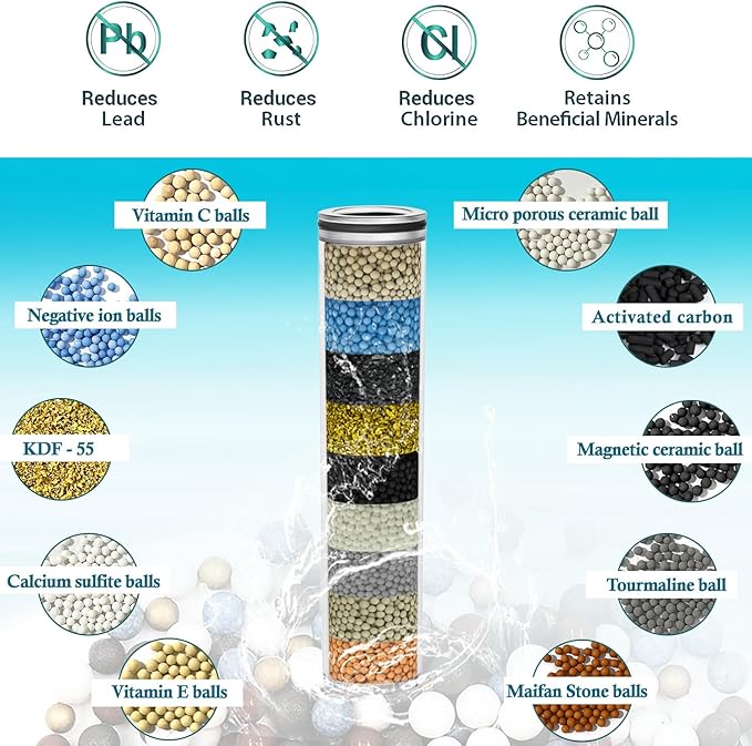 - Health Care Shower System: Our shower filter cartridge has KDF -Maifanshi activation ball -Negative ion sphere -Calcium sulfite dechlorination ball-Tourmaline ball stages of filtration for effectively reduces chlorine, heavy metals, fluoride, lime and scale in water.