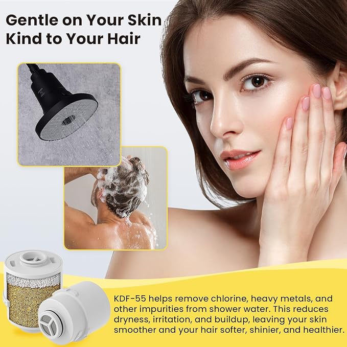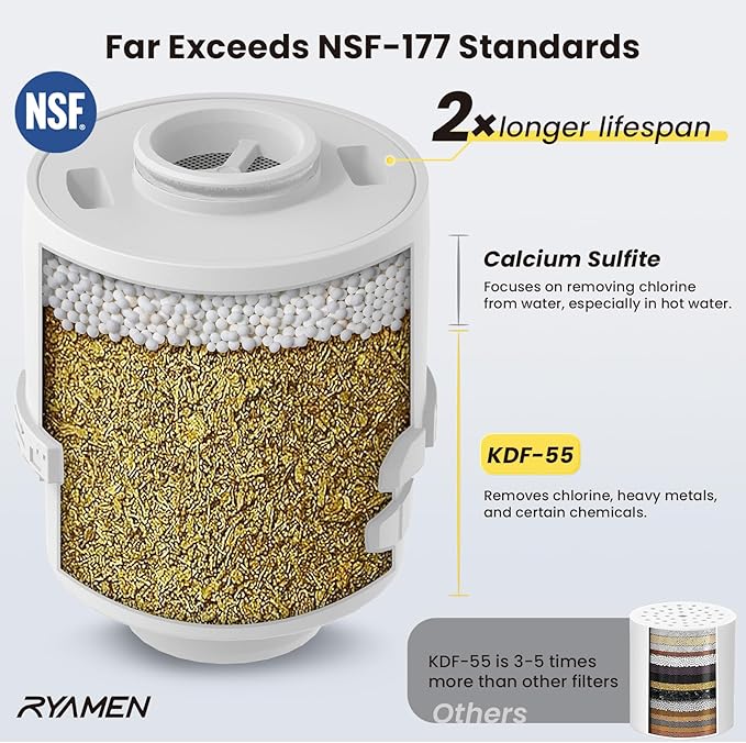 - Premium Quality Shower Filter: featuring a proprietary blend of KDF-55 and calcium sulfite, Ryamen shower filter far exceeds NSF-177 standards and lasts 2× longer than other filters. Shower water filter can effectively removes chemicals, sediments, and chlorine, purifying water for healthier hair and skin, helps reduce itchy skin, hair loss, and dryness