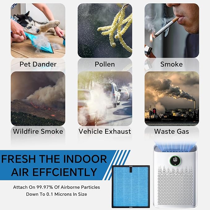 - 3-STAGES FILTRATION: 1.Nylon Pre-Filter obstructs large particles such as hair, dust, lint, fibers and pet fur, 丨2.H13 True HEPA Filter absorbs dust, pet dander, smoke, pollen, and other particles,丨3. Activated Carbon Filter absorbs cooking smells,smoke,Toilet odor and pet odors