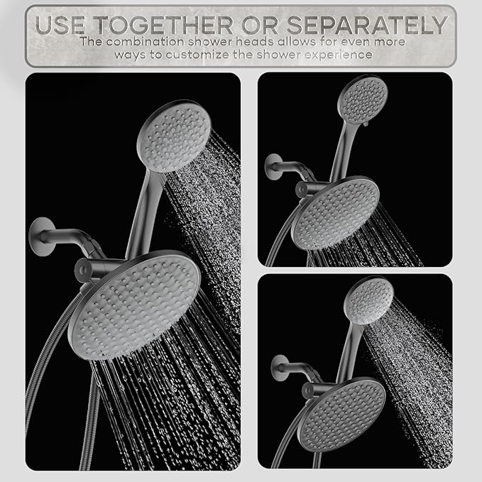 - Modern Multi-Function Shower System: Sleek design with premium quality and robust water pressure. Effortlessly switch shower modes with a solid brass 3-way water diverter, enabling smooth transitions between each shower head or run BOTH at the SAME TIME with maximum flow. Rub-Clean Jets prevent lime buildup and hard water deposits, ensuring consistent powerful flow