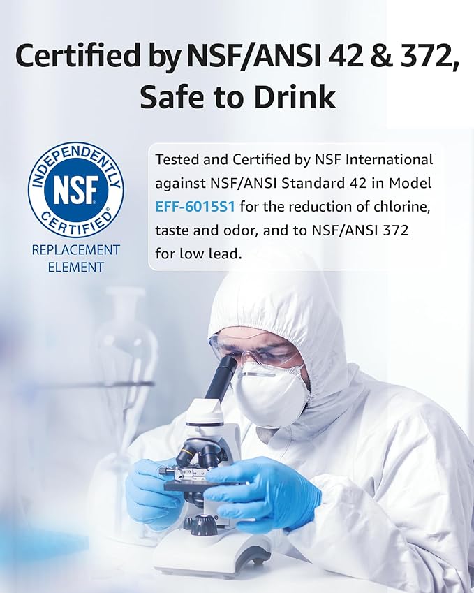 - This EcoAqua EFF-6015 refrigerator water filter replacement, despite its affordable price, offers - a mix of prior filtration performance and important certifications from the well-known regulatory body in the industry – NSF 42 and NSF 372 certificates.