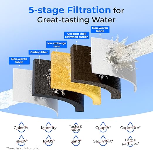 - [5-stage Filtration for Cleaner Water] This water filter pitcher adopts 5-stage filter materials including advanced carbon fiber, ion exchange resin and activated carbon block, and can efficiently reduce chlorine, mercury, taste&odor, copper, cadmium, PFOA&PFOS, sand, sediment and large particles, tested by a third-party lab, offering pure, refreshing water for you and your family. Note: This system DOES NOT lower TDS value.