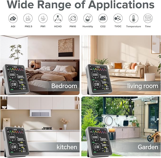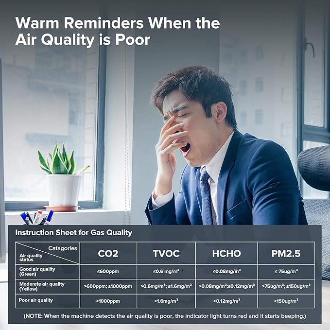 - 【Buzzer Alarm】The air quality monitor built-in "BBB..." buzzer will trigger an alarm whenever any air quality level reaches a dangerous threshold, promptly alerting you to current air conditions. Once activated, the buzzer can Short press lo tum onoff the beeps off to ensure it doesn’t disturb your rest time.