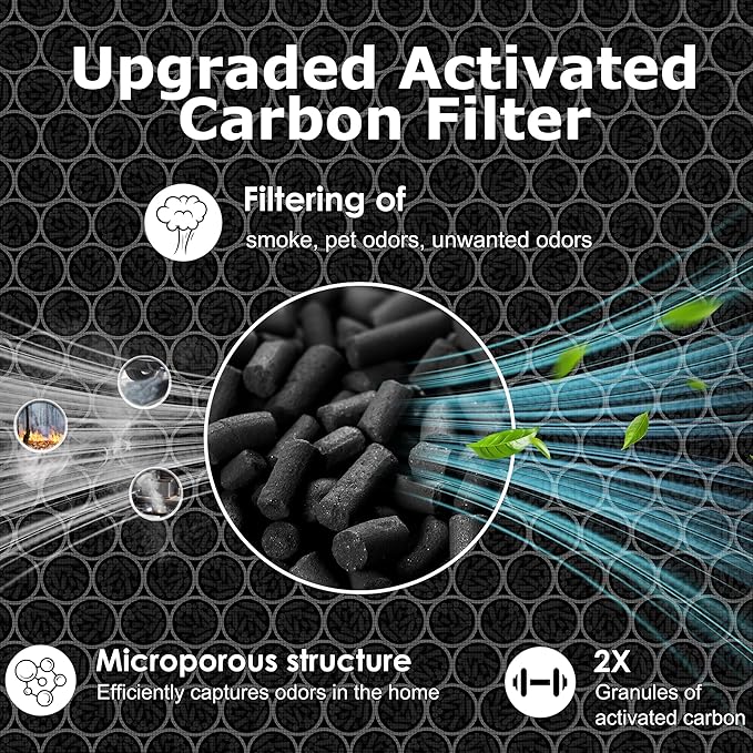 - Efficient and Long-Lasting: The high-efficiency H13 true HEPA air filter is capable of capturing airborne particles as small as 0.3 microns. The pre-filter made of activated carbon effectively absorbs smoke, cooking fumes, odors, and VOCs.