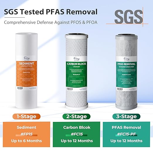 - Comprehensive 3-Stage Filtration ā A 5-micron sediment filter removes dirt, sand, and rust; the CTO carbon block eliminates chlorine and unpleasant tastes; and the specialized PFAS stage targets stubborn chemicals for clean, refreshing water.