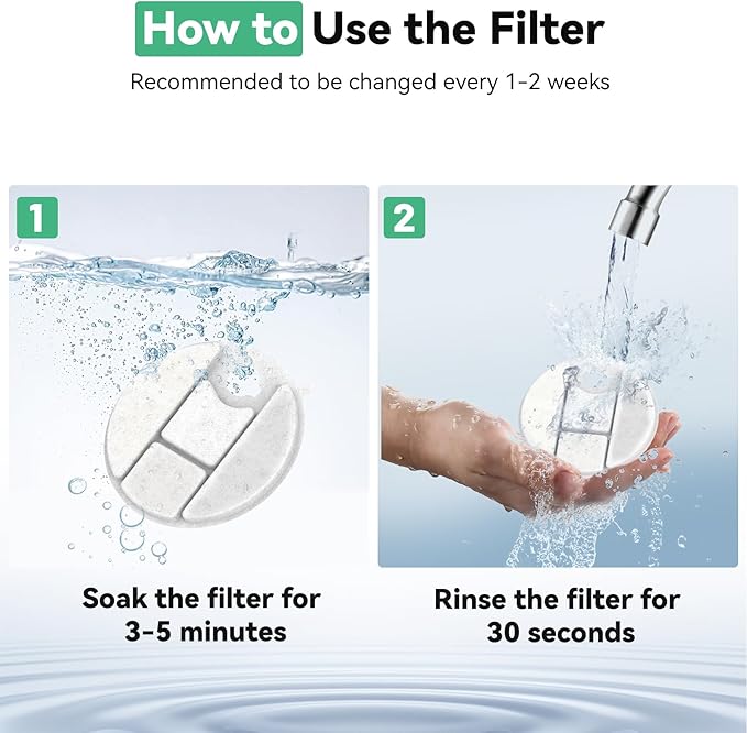 - Recommendation: To prevent carbon dust from falling into the water, soak the filter in water for 5 minutes before use, then rinse the filter under running water for 30 seconds to remove excess carbon dust for best results. It is recommended to change the filter every 1-2 weeks.