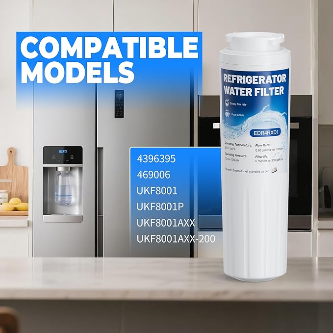 - COMPATIBLE MODELS:EDR4RXD1 water filter Replacement Compatible with UKF8001,EDR4RXD1,4396395,UKF8001AXX,UKF8001AXX-200,PURICLEAN II,UKF8001P,469006,WF295,WRF555SDFZ16,WRX735SDBM00,KRFC300ESS01, Note: This is not an original filter. Before purchasing, please confirm whether these products are suitable for your product to avoid getting the wrong one.