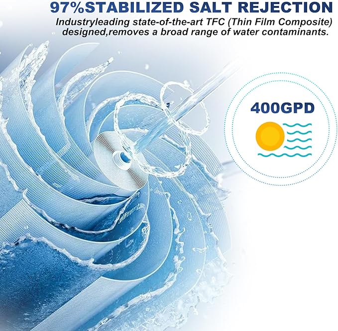 - High quality RO membrane: Reverse Osmosis membranes are made of 100% Thin Film Composite (TFC) material for purification performance with the characteristics of water saving, large water flow and stable performance. Reverse Osmosis Membrane 400 GPD 3013-400