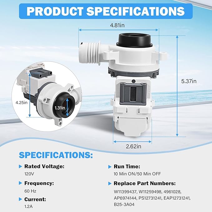 - REPLACE PART NUMBER - W11399437, W11259498, 4961028, AP6974144, PS12731241, EAP12731241, B25-3A04 | Specifications: 120V | 60 Hz | 1.2 Amps | 10 Minute ON, 50 Minute OFF; Please check fitments and replace part numbers before ordering.
