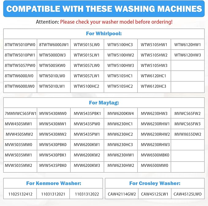 - FIT THESE WASHER MODELS - Compatible with Whirlpool, Crosley, Kenmore and Maytag washer models including Models WTW5100HC1 8TWTW5010PW0 8TWTW5010PW1 8TWTW5057PW0 8TWTW6000JW0 8TWTW6000JW1 MVW4505MW0 WTW5000DW3 WTW5005KW0 WTW5010LW0 WTW5010LW1 WTW5015LW0 WTW5015LW1 WTW5057LW0 WTW5057LW1 WTW5100HC2 WTW5100HC3 WTW5100HW2 WTW5100HW3 WTW5105HC1 WTW5105HC2 WTW5105HW1 WTW5105HW2 WTW6120HC1 WTW6120HC3 WTW6120HW1 WTW6120HW3, etc,. Other applicable models please refer to the product description. Thanks!