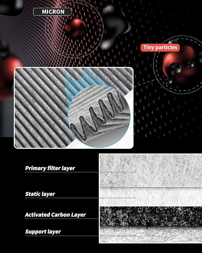 - The internal cabin air conditioning filter uses multiple layers of high-quality filter materials to reduce PM2.5 particles in the air efficiently. Activated carbon effectively adsorbs harmful gases such as formaldehyde and removes car exhaust and pollen, etc., providing drivers and passengers with clean and fresh air.