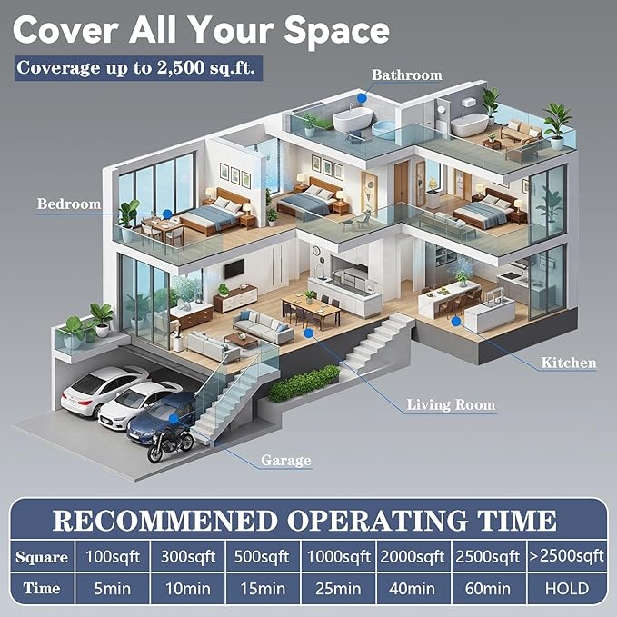 - 【PORTABLE & VERSATILE DESIGN】Encased in a durable all-metal shell, this compact ozone machine weighs just 4.4 pounds and features a foldable handle for easy portability. Ideal for homes, cars, basements, offices, kitchens, bathrooms, boats, and more—covers up to 2,500 Sq. Ft.