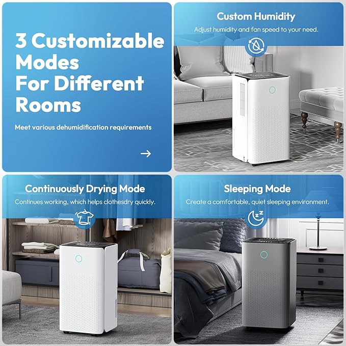 - 【Multiple Humanized Functions】With upgraded 360° airflow, this multifunctional dehumidifier offers a specifically designed laundry dry mode that can quickly remove excessive moisture from clothes and keep them dry and clean which makes it suitable for wet weather. Two different fan speeds will meet the various dehumidification needs of anyone by switching freely between the 2 modes. With 45dB ultra-quiet operation, and the night sleep mode provides a quiet environment so that you can sleep.