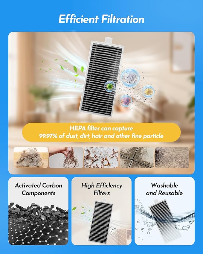 - 【EXCELLENT FILTRATION】Multi-layer filtration material dust bags capture 99% of pollutants and seal without leaking, while the HEPA filter traps tiny particles of dust, pet hair, and odors. The included cleaning brush tool easily removes hair tangles to prevent your vacuum cleaner from getting stuck. These high-quality replacement parts help maintain your vacuum robot's efficient operation