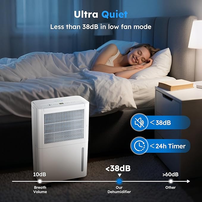 - ULTRA QUIET OPERATION – This dehumidifier operates at less than 38db in low fan mode, ensuring a peaceful environment for sleep, reading, or watching TV without disruptive noise.