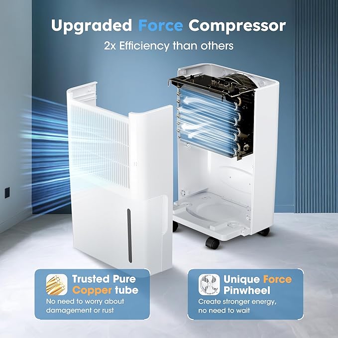 - Powerful Moisture Control: With the upgraded FORCE compressor in our dehumidifier, you enjoy 2x the efficiency compared to standard models! The unique FORCE pinwheel works to create stronger energy, meaning you won’t have to wait long for effective moisture removal from any room in your home. Plus, the trusted pure copper tube construction ensures you don’t have to worry about damage or rust, giving you lasting peace of mind and reliability for years to come.