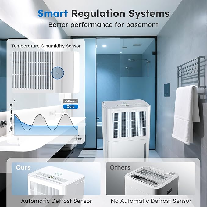 - Smart Regulation Systems & Automatic Defrost Sensor: This dehumidifier features an advanced smart regulation system that helps optimize your space by maintaining perfect temperature and humidity levels for your comfort. With an automatic defrost sensor, this dehumidifier detects coil frost and intelligently adjusts its mode, ensuring efficient performance in various conditions.