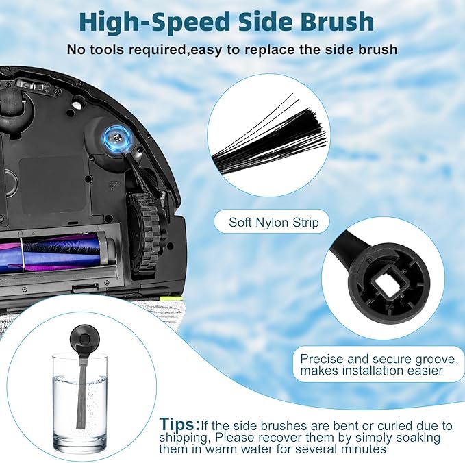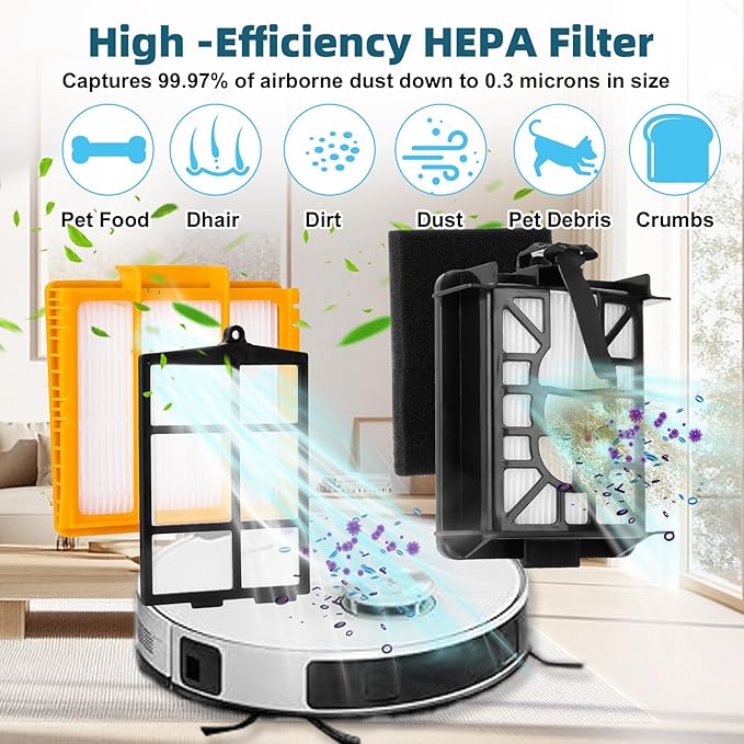- Package Includes:1 Main Brush,2 HEPA Filter,6 Side Brushes,1 pre-filter,1 self-empty clean base filter,2 sets of sponge filters,4 mop pads,1 Cleaning Brush