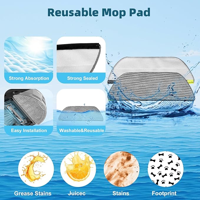 - Cleaning Kit:Includes main brush,side brushes, and reusable mop pads for thorough floor care (sweeping, mopping,and edge cleaning)