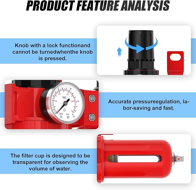 - 【Stage 1-Regulator/Filter】The knob has a locking function that prevents it from being turned when pressed, ensuring accuracy and safety during use. The filter is fitted with a 5 micron cartridge which effectively filters out 95% of particles and water from the air.