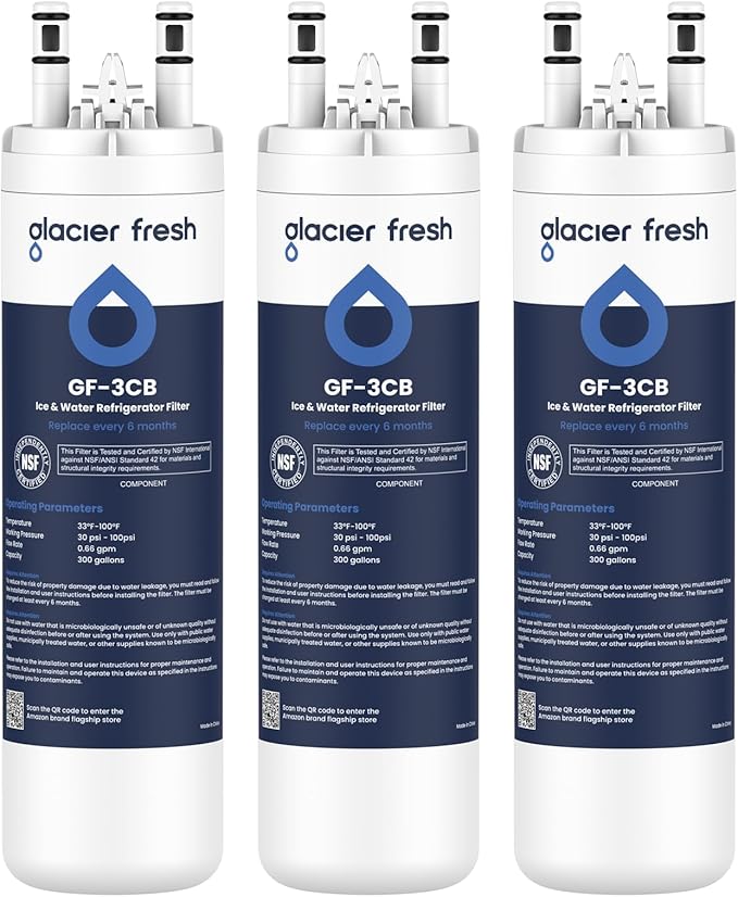 - Authoritative Certification: GLACIER FRESH WF3CB refrigerator water filter's material, structure, and performance are all tested by NSF42 standards. You can look up model number "GF-WF3CB" in NSF's database. Tested and verified by an independent laboratory, GF-WF3CB removes 97.9% of chlorine and improves the odor and taste of water.