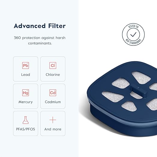 - NANO ZERO FILTER TECHNOLOGY– Independently tested to NSF/ANSI 42, 53, & 401 standards. This plant-based carbon filter effectively removes chlorine, lead, mercury, PFAS (PFOA/PFOS), benzene, VOCs, cadmium, copper, HAA5, pharmaceuticals, particulates, and microplastics down to 40 µm.