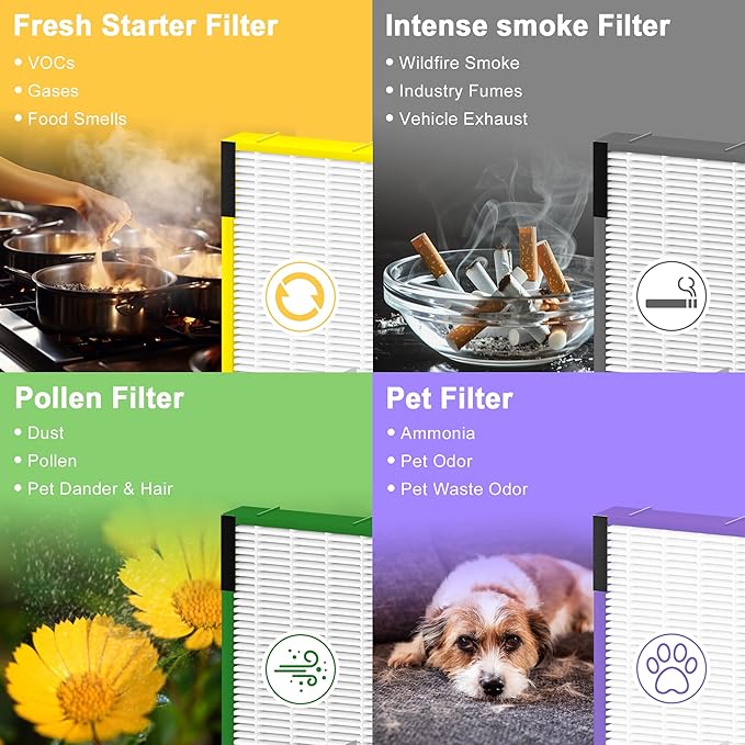 - š šØšš§šš£šš šššš§šš„ ššš¢šššš¦ - Choose from a variety of PETOX FLT4825 replacement filters for your air purifier to protect your family and pet's health. The yellow hepa pure filter is custom for daily multi-purpose coverage. The purple pet care filter is ideal for pet lovers and pet family. The green to-xin absorber filter specializes in unpleasant odors spread by smog. And the grey smoke remover filter is designed for wildfire gases. There must be one for you