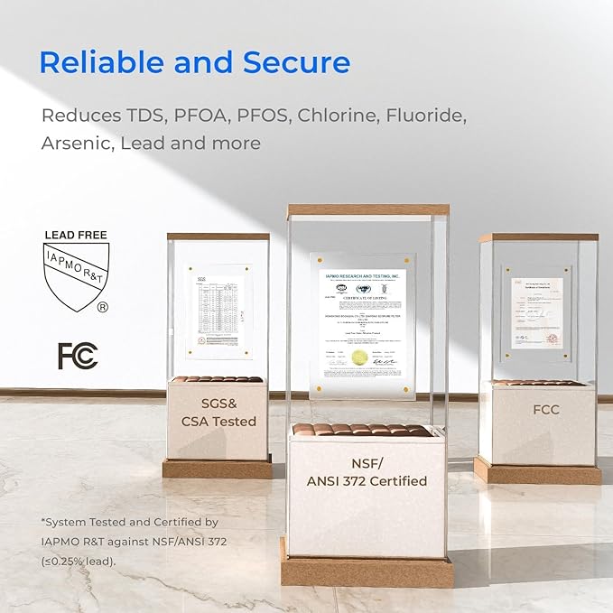 - [ 6-Stage RO Filtration ] Certified for safety with NSF/ANSI 58&372 lead-free material standard and SGS-tested, the C1 system uses premium 0.0001μm RO membrane to reduce TDS、PFOA、PFOS、chlorine、fluoride、arsenic、lead and more, providing you healthy water.