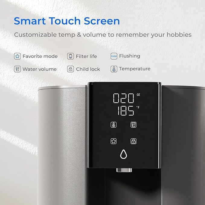 - [ Easy to Operate ] This instant hot RO system features an intelligent digital screen for temperature and filter life monitoring. When the TDS >150, the water dispenser key icon (💧) will flash a reminder. Choose from 5 water volumes and temperatures. Also, you can easily customize and memorize your favorite mode for personalized hydration.