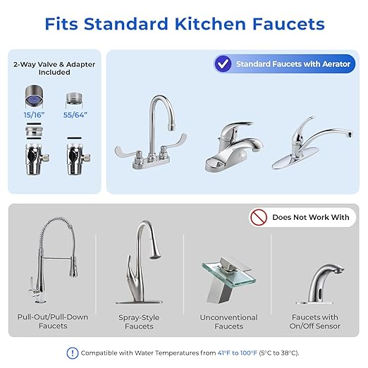 - Easy Installation: Installs in minutes without drilling or plumbing. Compatible with most standard kitchen faucets and includes all necessary parts like a wrench and adapters. Switch between filtered and unfiltered water easily using the diverter valve.