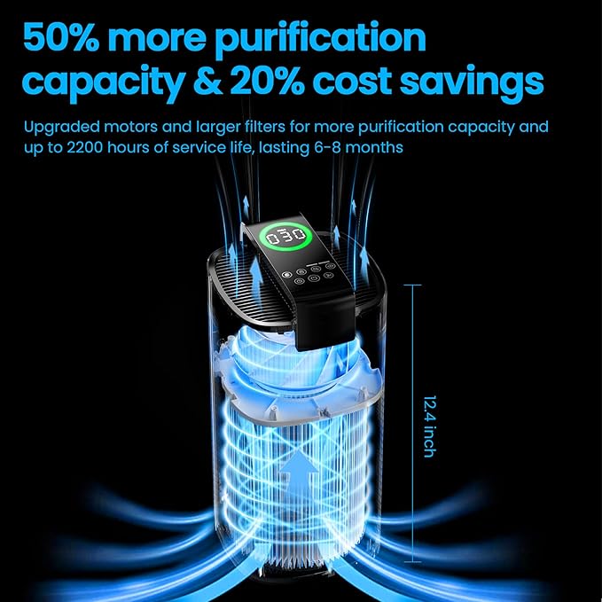 - True HEPA Filtration air purifier: Features a 4-layer HEPA air purifier filter. Combined with activated carbon, it is the ideal air purifiers for home pets, odors and pollutants. The filter on this air purifiers for home has a life expectancy of up to 2200 hours. Especially during fire season, this large air purifier for home large room absorbs smoke and keeps the air clean
