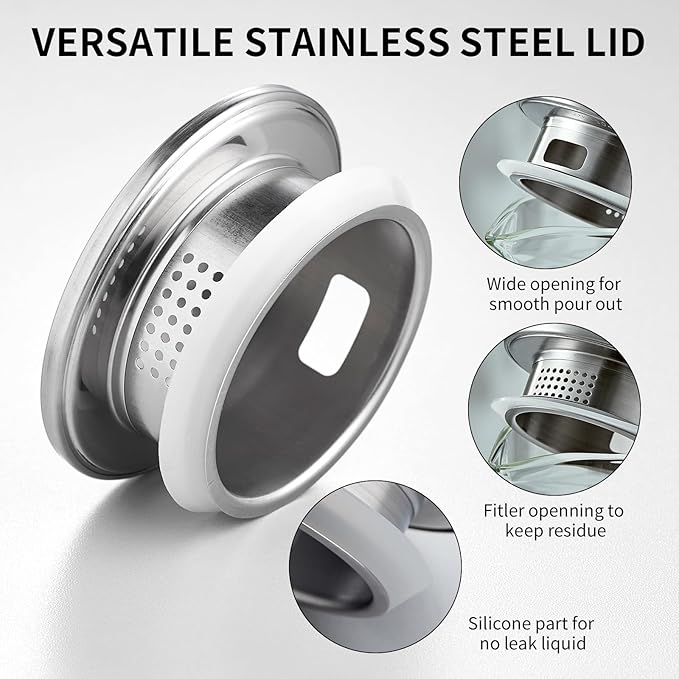 - High Borosilicate Glass: The water pitcher is made of heat resistant Borosilicate glass and can Two Different Pour Functions: The iced tea pitcher comes with premium 304 stainless steel lid that has 2 different pour functions, one with tiny holes to act like a strainer to keep ice or fruits inside pitcher when pouring and 180 degree turn of the cap provides a βwiderβ mouth. The lid also has a silicone ring that improves sealing performance and reduces leaks or spills.