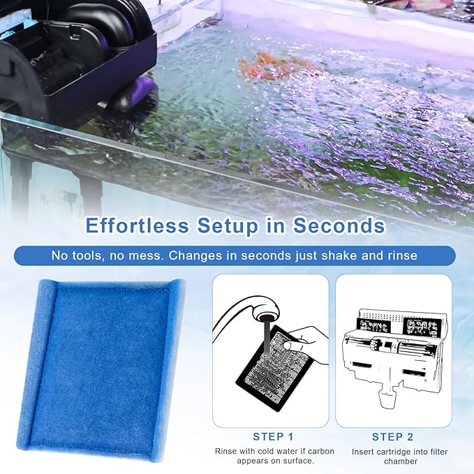 - 【Effortless Setup in Seconds】Slide the pre-assembled filters for fish tank under cool water to rinse away carbon dust, align its keyed base, and push it straight into the aquarium filters chamber until it clicks—done. No tools, no mess, just shake, rinse, and enjoy fresh filtration in seconds.