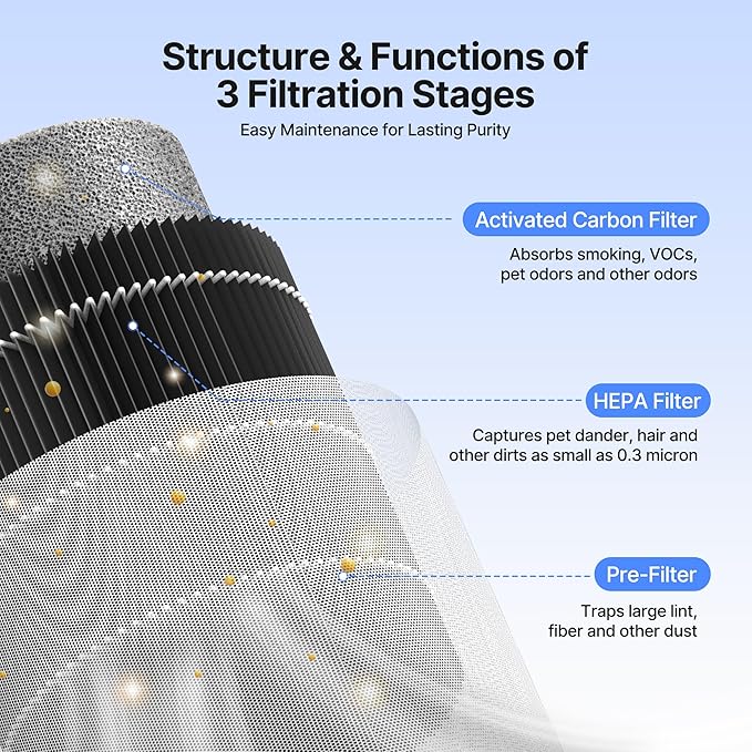 - Ultra-quiet 22dB Operation: Our air purifiers for bedroom delivers clean air and a calming atmosphere with its soft blue ambient light. Switch to sleep mode, and the light gently fades after 3 seconds. At just 22dB, it’s quieter than a rustling leaf, creating a peaceful, dark environment for restful sleep. Ideal for those who want healthy air and a cozy, serene sleeping space